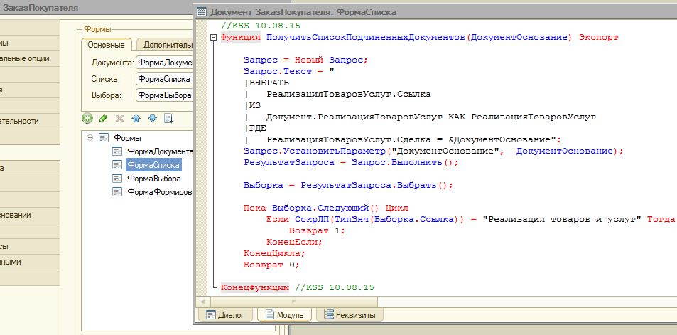 Откроем конфигурацию и, например, в документе "ЗаказПокупателя" откроем модуль ФормыСписка.
