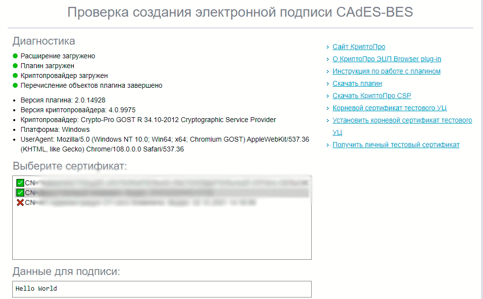 Переходим на страницу проверки плагина КриптоПро ЭЦП Browser plug-in