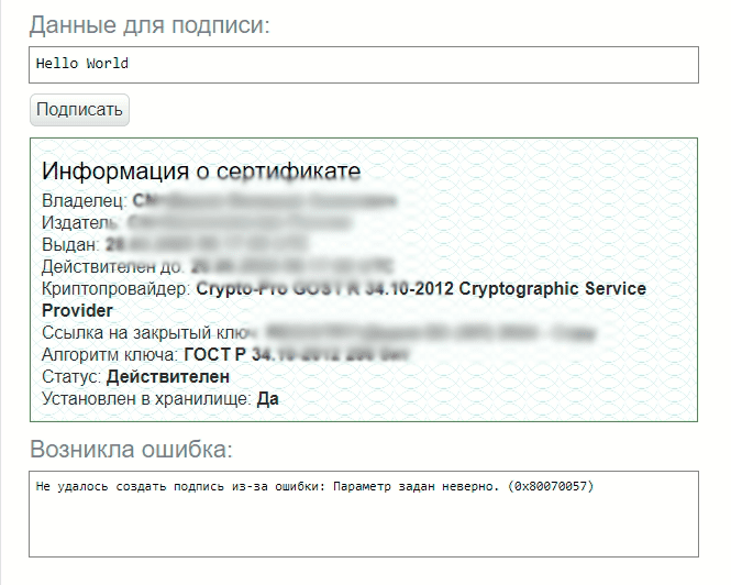Но при тестовом подписывании выходит ошибка 0х80070057
