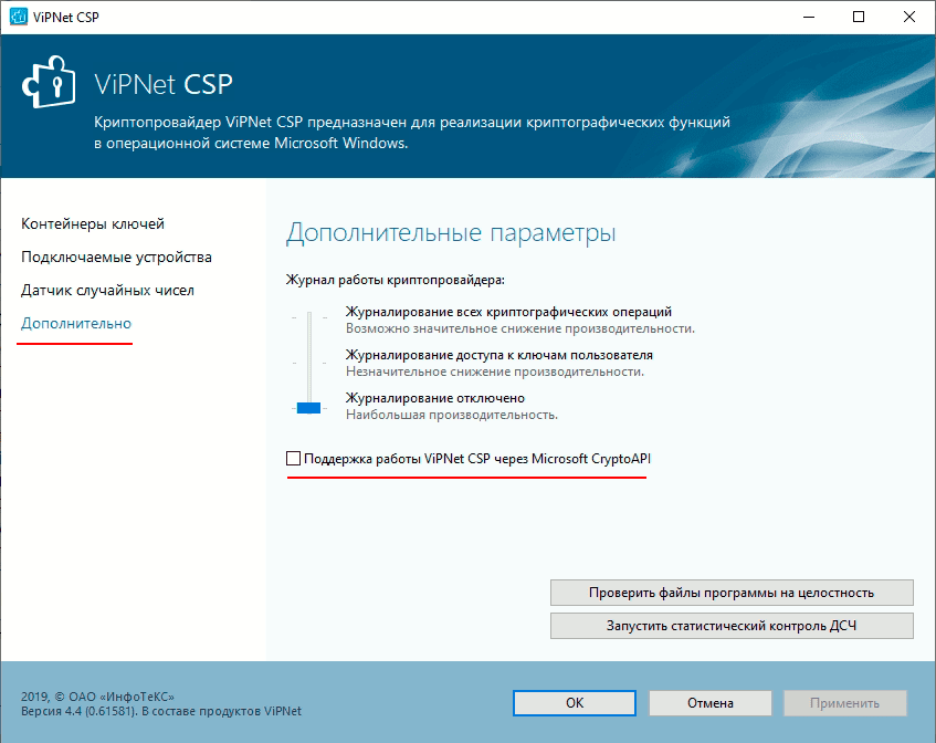 Заходим в ViPNet CSP переходим во вкладку дополнительно и отключаем настройку.