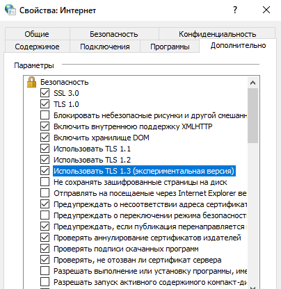 4. Разрешить в Свойствах браузера в Панели Управления все TLS и SSL.