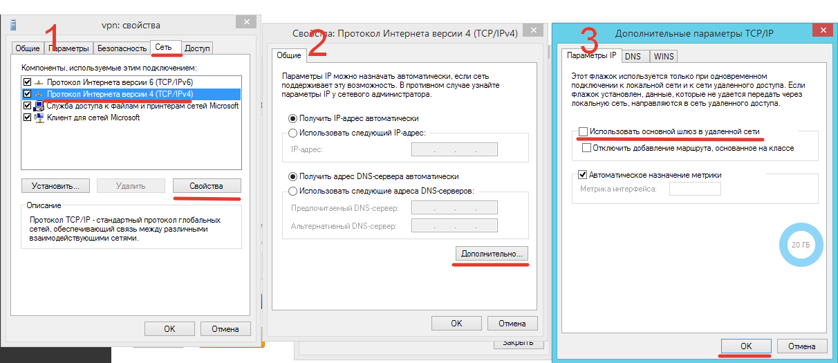 Далее, нажать "Дополнительно" и снять галку с "Использовать основной шлюз в удаленной сети"