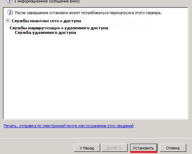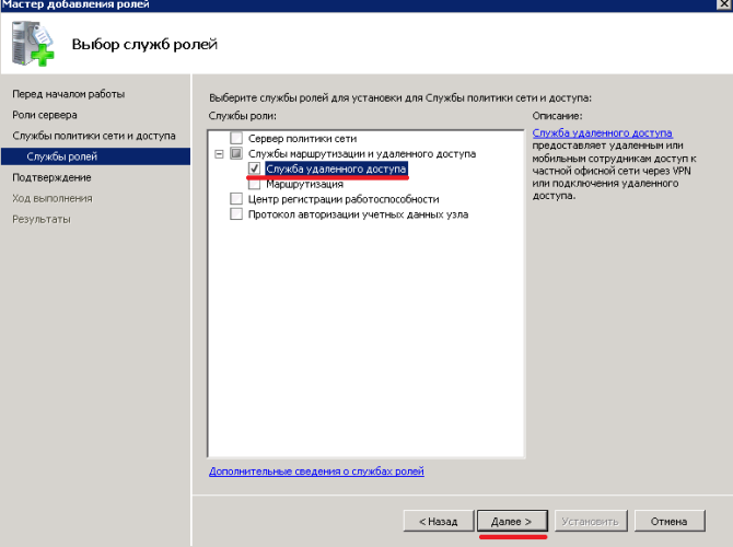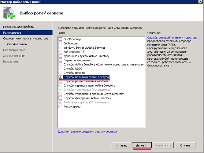 Далее установить галку на "Службы политики сети и доступа", нажать далее.