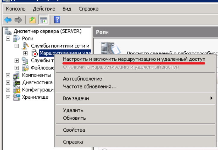 Выбрать в ролях "Службы политики сети и удаленного доступа", кликнуть правой кнопкой "Маршрутизация и удаленный доступ" > "Настроить и включить маршрутизацию" тем самым запустить мастер настройки.