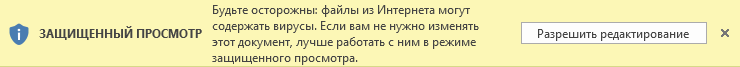 При открытии файлов Word, Excel и пр. скачанных из интернета, либо из локальной сети, новые версии программ пакетов MS Office запускают так называемый "Защищеный просмотр" файлов.