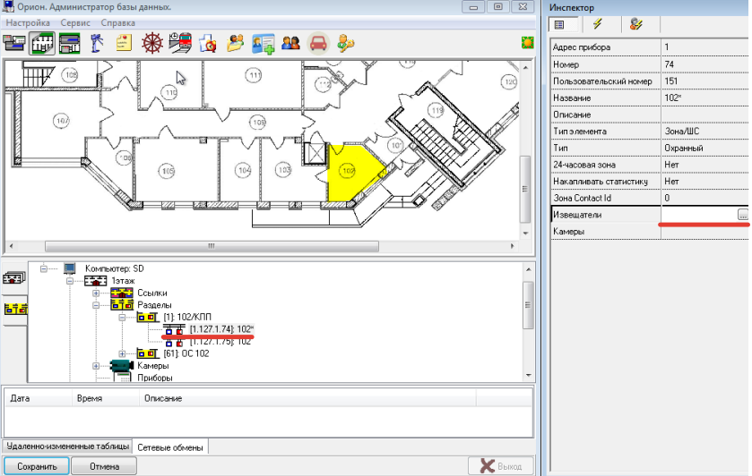 Для того, чтобы разместить датчики, необходимо выбрать раздел и подпункту(адресу датчика) в инспекторе присвоить символ текущего датчика. Для этого выбрав датчик, нажать на кнопку Править. Далее в инспекторе добавить Извещатель.