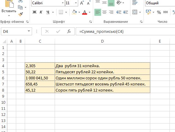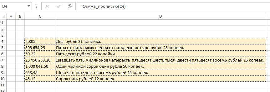 Теперь пробуем ввести число и справа, например, ставим =Сумма_прописью(C4)