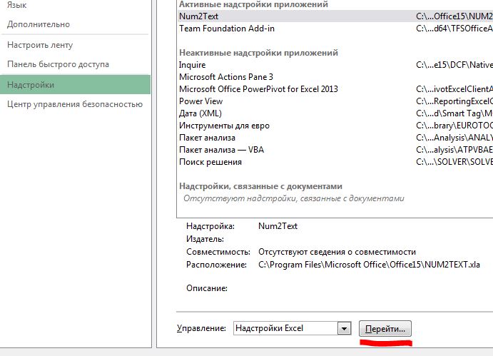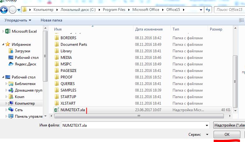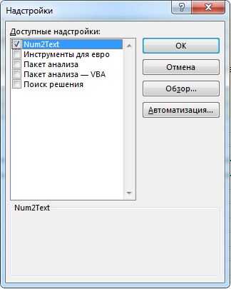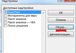 Нажимаем "Обзор" и выбираем ранее загруженный файл NUM2TEXT.xla