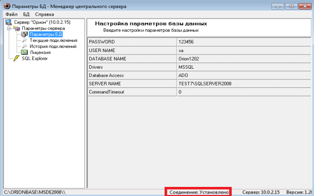 Проверяем подключение к серверу. Для этого запускаем "Управление сервером" (пароль по-умолчанию 73173100) и в окне должно быть "Соединение: установлено".