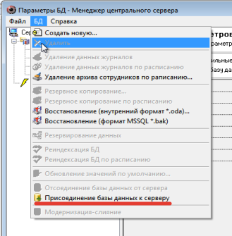 Находим в менеджере центрального сервера в меню БД пункт "Присоединение базы данных к серверу".